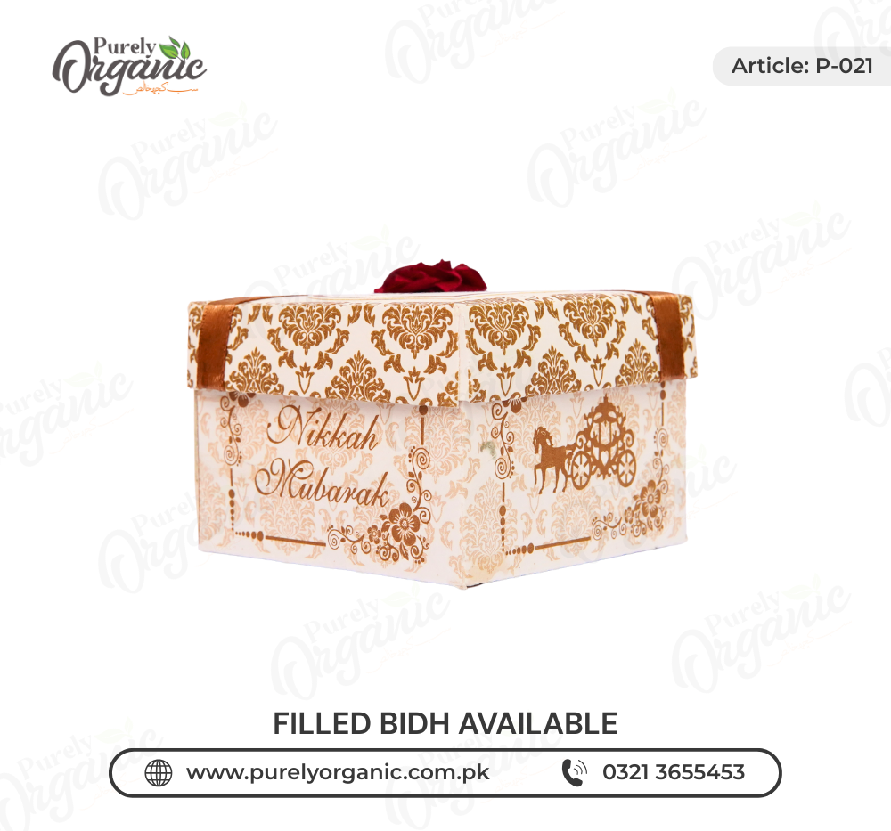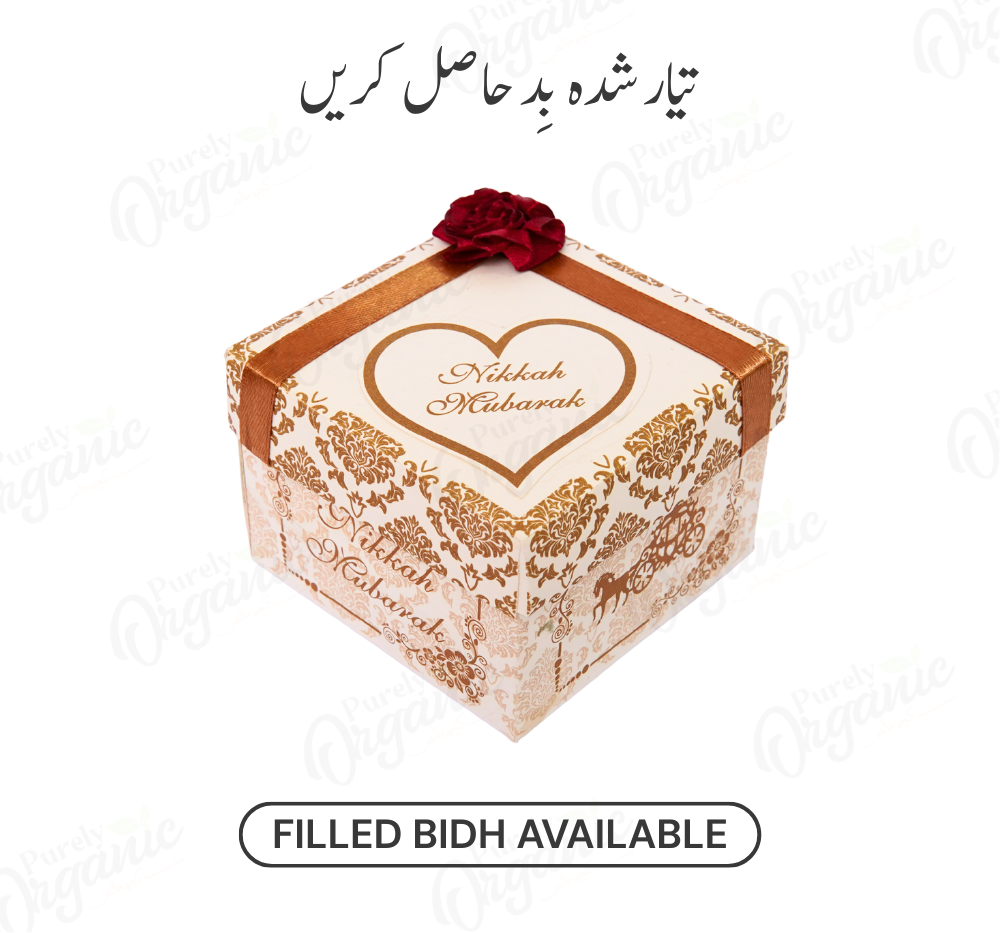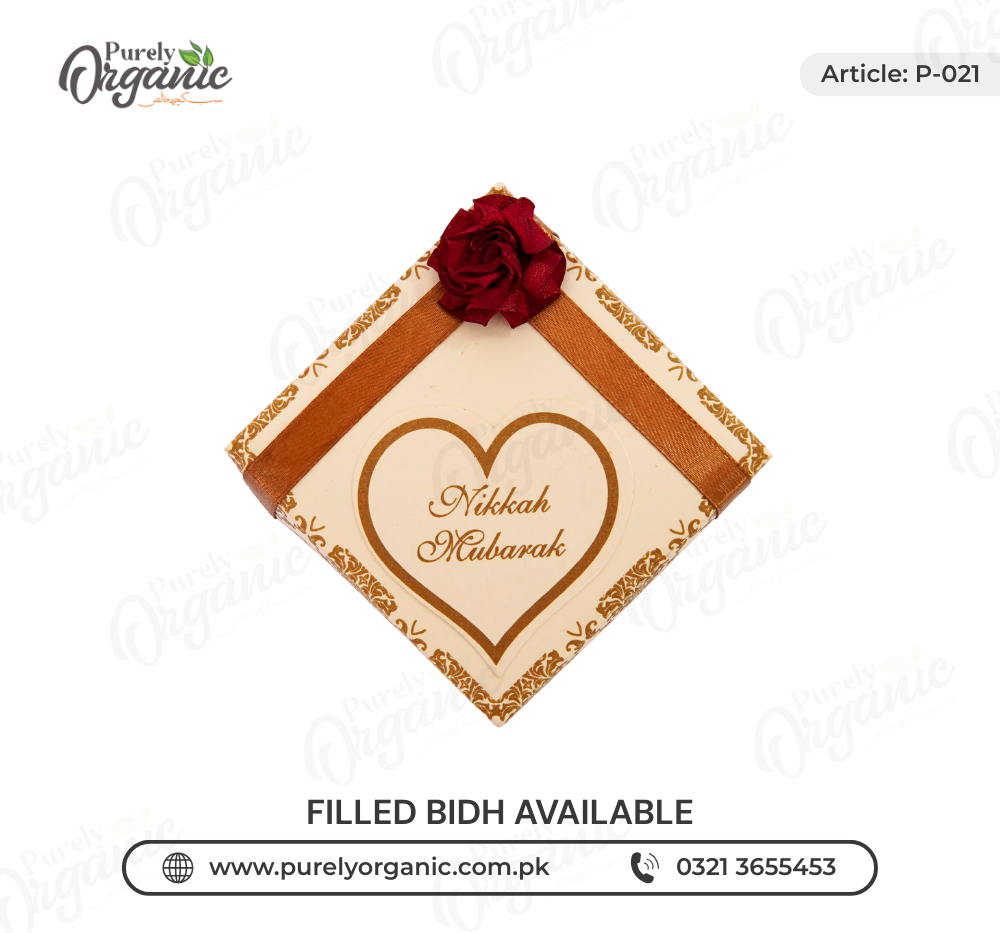 The Bidh Box With Tag is a stylish and practical packaging choice, complete with a customizable tag to add names, dates, or personal messages. Perfect for weddings, nikkah, and festive occasions, it’s ideal for presenting dry fruits, chocolates, or small keepsakes in a tension-free, beautifully personalized way that guests will remember.