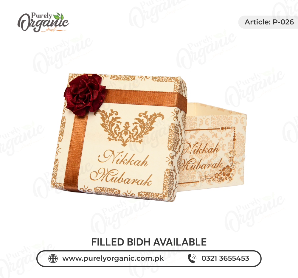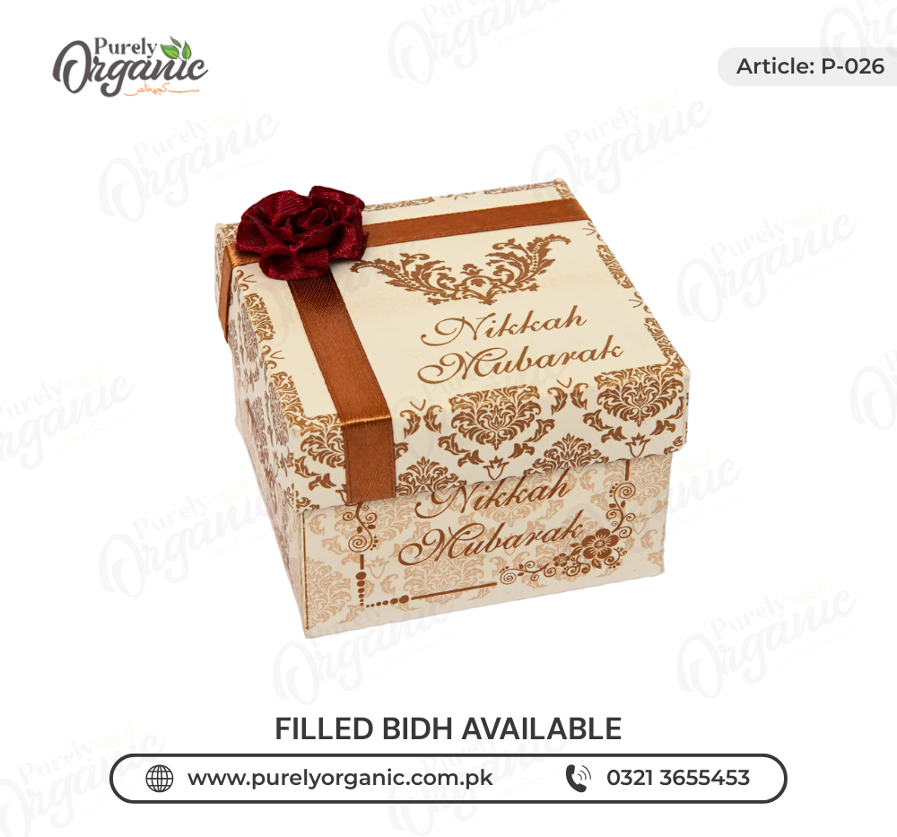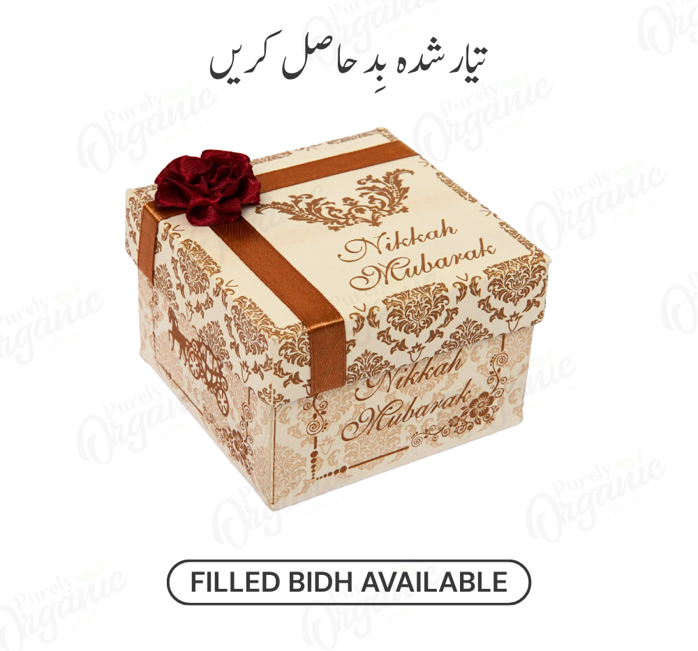 The Classic Luxe Filled Bidh Box is a timeless expression of luxury, featuring an elegant design filled with premium, hand-selected dry fruits. Perfect for weddings, nikkah ceremonies, or festive events, it offers a ready-to-serve, tension-free gifting solution that combines tradition, style, and superior quality for an unforgettable guest experience.