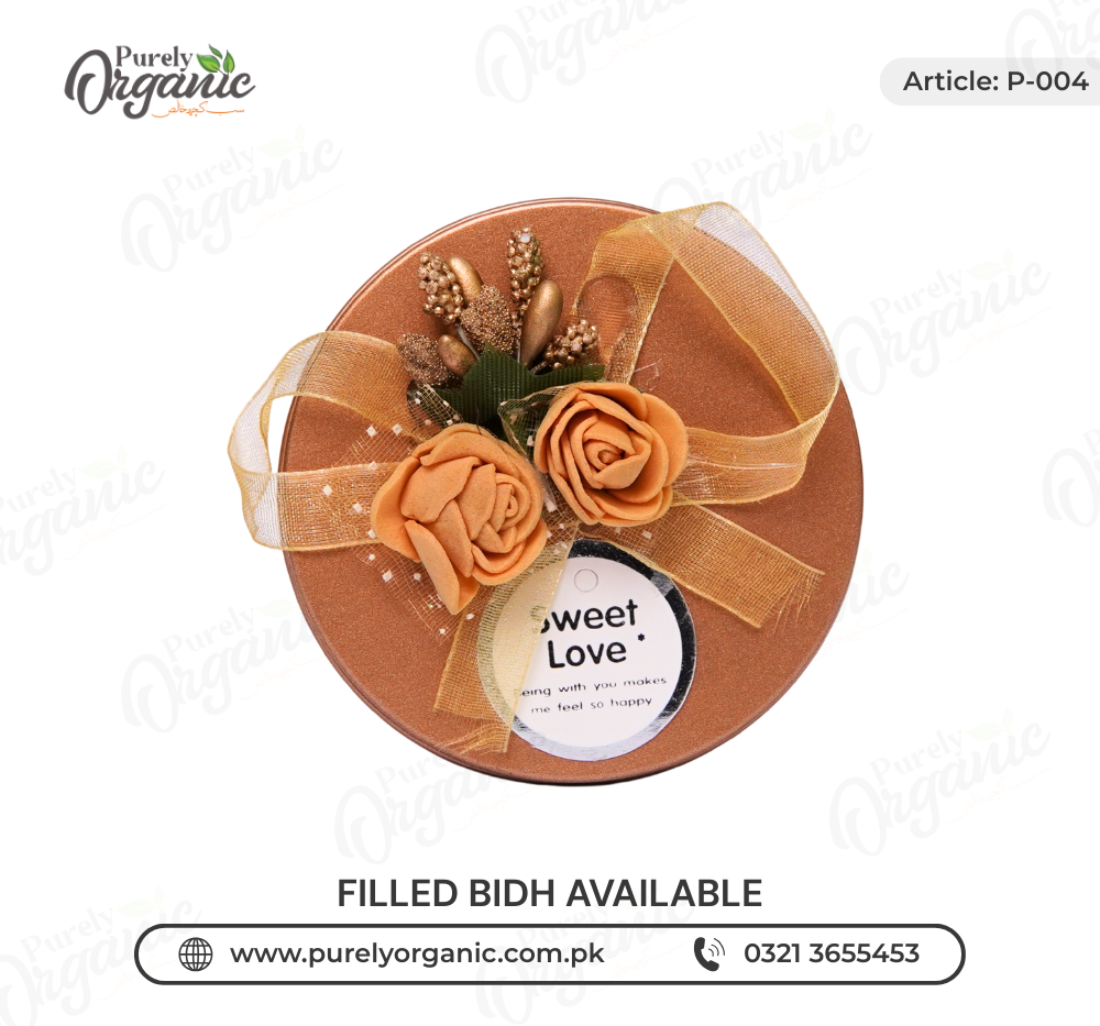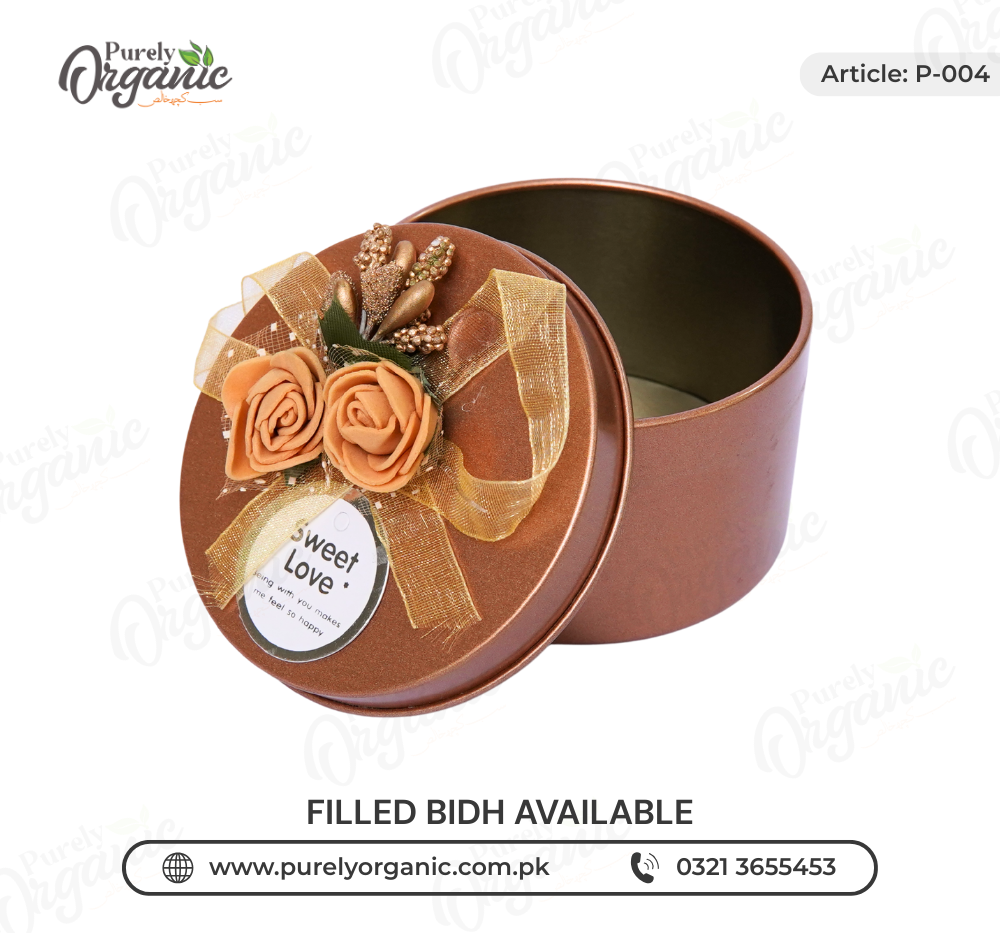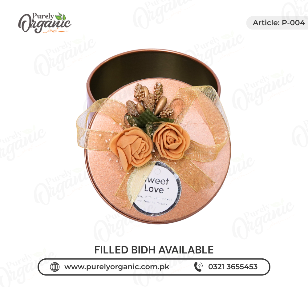 Make your Nikkah ceremony unforgettable with our Imported Round Tin Bid Box, premium filled with an assortment of delightful treats. Designed to combine elegance and functionality, this bid box is an ideal favor to thank your guests for their presence on your special day.