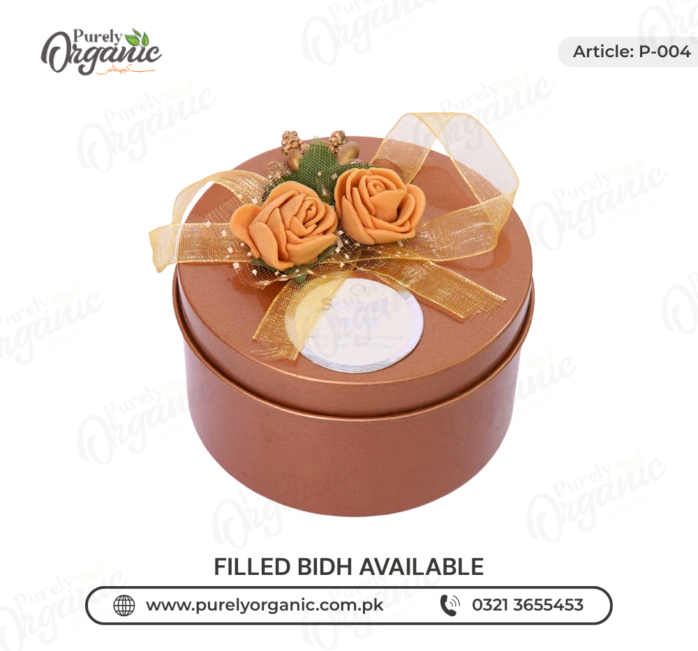 Crafted from high-quality tin, the round shape offers a unique and attractive packaging solution that stands out among traditional favors. The tin box is not only sturdy but also beautifully finished, ensuring your gifts stay safe and fresh. Inside, you’ll find a premium selection of sweets, dry fruits, or chocolates – carefully chosen to suit the joyous occasion.