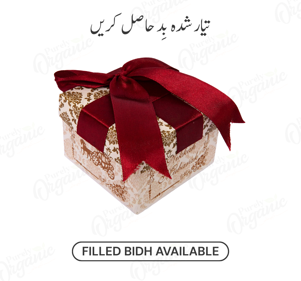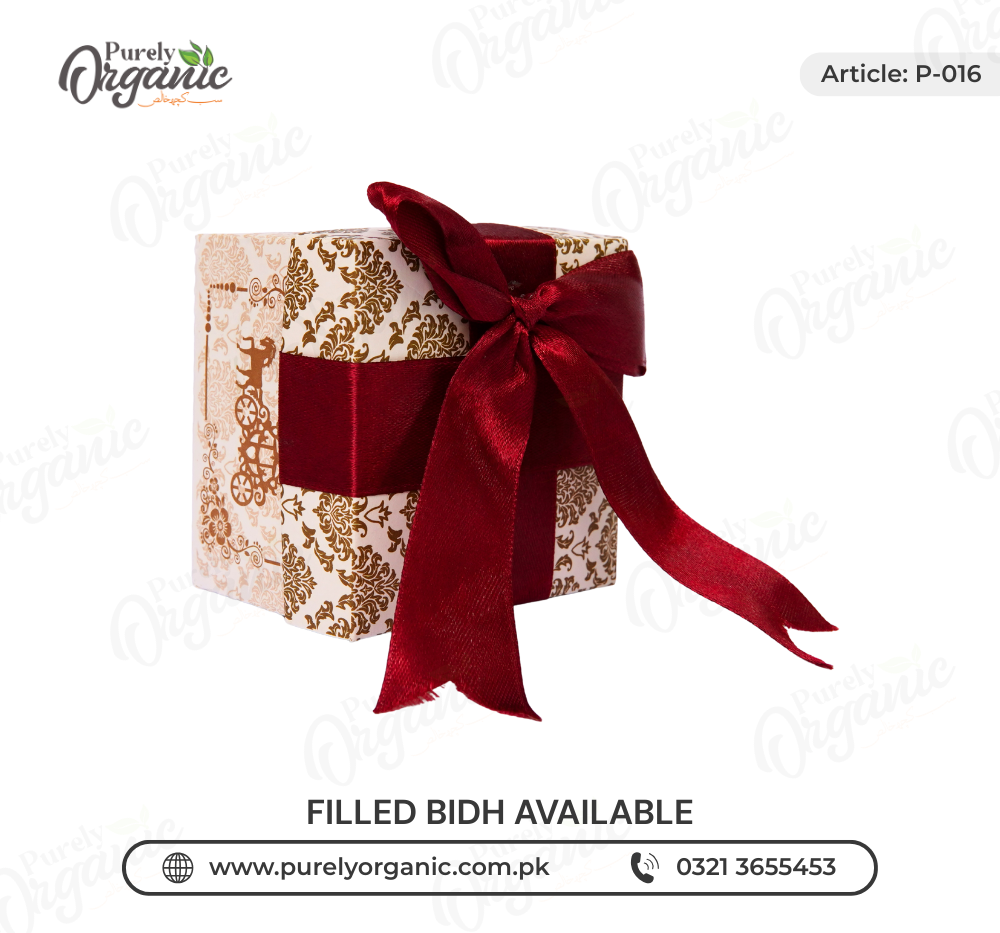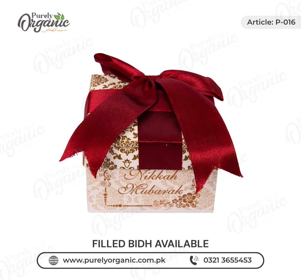 The Red Bow Bidh Box For Nikkah is a charming and elegant packaging choice, featuring a decorative red bow that adds a festive touch to your event. Perfect for presenting dry fruits, chocolates, or small keepsakes, it’s a lightweight, sturdy, and hassle-free way to elevate your nikkah favors and impress your guests with style.